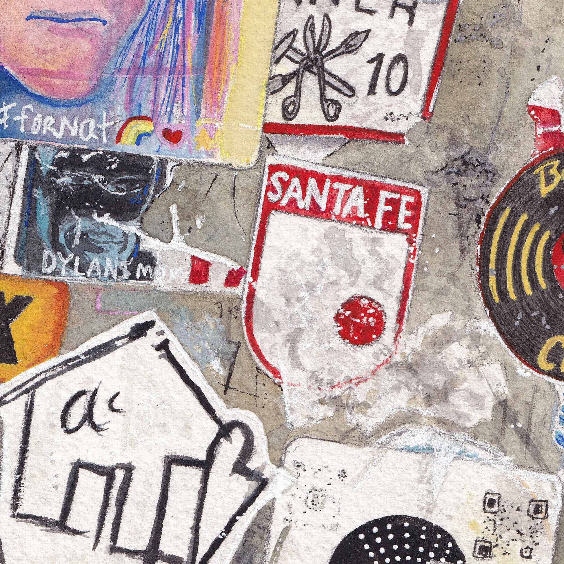 This painting captures a collage of layered stickers and street art attached to an urban pole, creating a dense, visual record of voices, identities, and moments in time. Portraits, band logos, slogans, and worn graphics overlap and fade into one another, suggesting years of passing hands and changing scenes. Set against architectural elements and open sky, the composition balances chaos with structure, inviting the viewer to explore each fragment. The piece celebrates street culture as an evolving archive—temporary, expressive, and deeply tied to place.