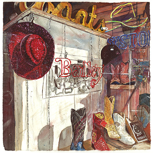 A vibrant watercolor study of cowboy boots and felt hats displayed in a Nashville storefront, where layered reflections of the bustling street outside shimmer across the glass. Marquee signage, worn leather, and neon glow blend together, capturing the rhythm of Nashville—a place where tradition, music, and everyday movement collide in a single, lively moment.