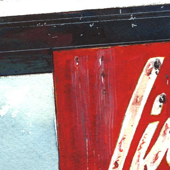 A quiet watercolor portrait of the faded roadside sign from the Steer Inn, its peeling paint and broken lettering suspended against a soft Midwestern sky. Timeworn textures and bold colors evoke the memory of a once-familiar gathering place, celebrating the beauty found in abandonment and the stories held by small-town landmarks.