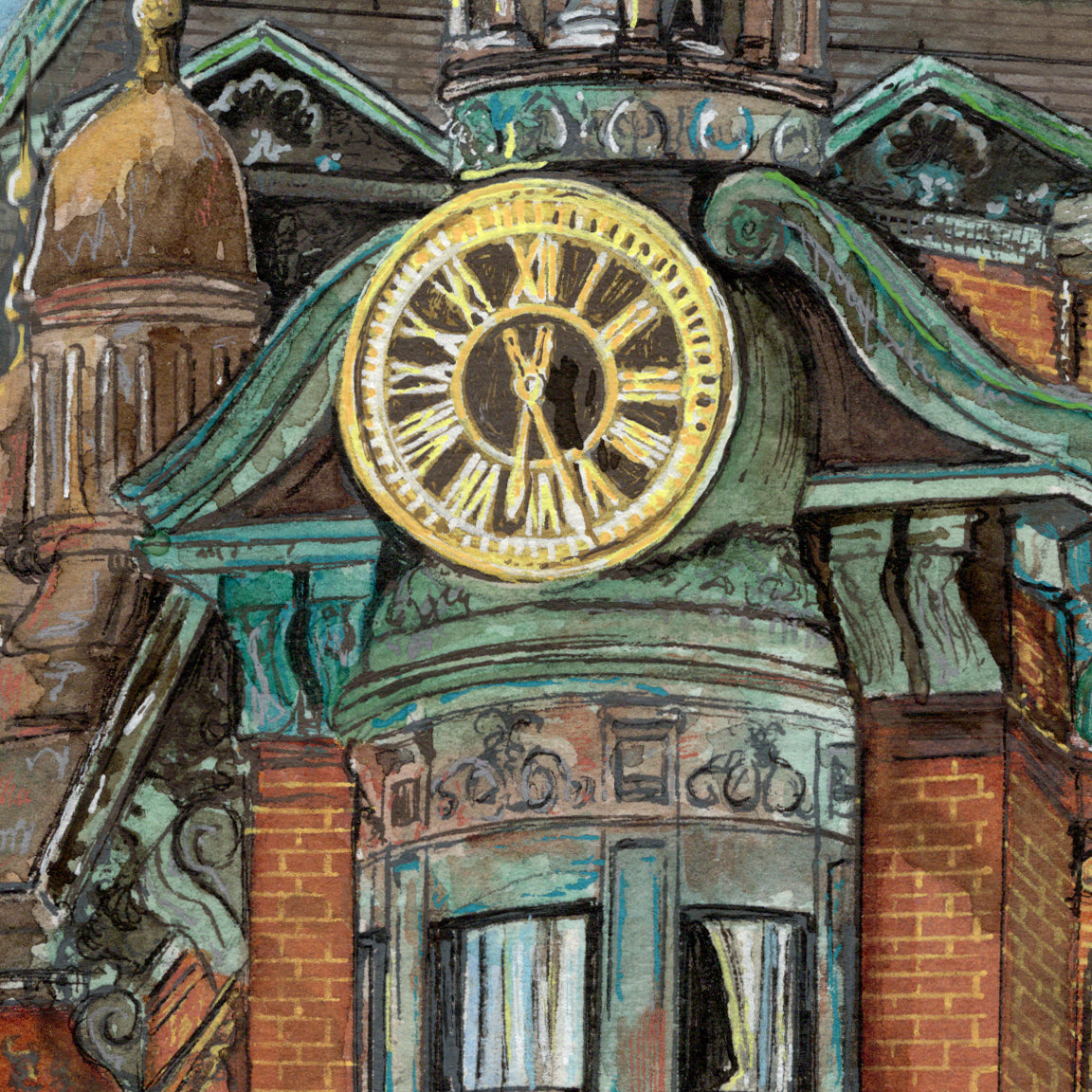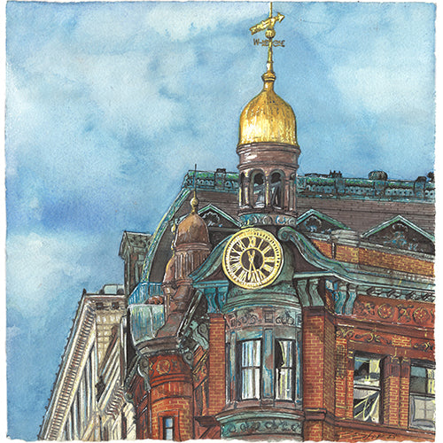 A warm, detailed watercolor portrait of the Historic SunTrust Building, capturing the elegance of its gilded dome, clock face, and richly textured brickwork. Loose washes of blue sky contrast with precise architectural lines, highlighting the building’s historic character while celebrating the quiet beauty of everyday urban landmarks in Washington, D.C.