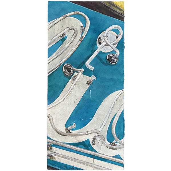 A close, abstracted watercolor study of the glowing neon from the Holiday Motel, located in Cave City, Kentucky near Mammoth Cave National Park. Cropped tightly to focus on looping tubes and metal brackets, the composition transforms familiar roadside signage into flowing lines and cool blue washes—celebrating the craftsmanship and nostalgic charm of classic American travel.