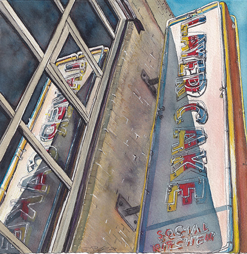 This painting looks upward at the Layer Cake sign as it clings to the side of a Nashville building, its vertical letters glowing with character and history. Rendered from a street-level perspective, the sign feels tall and slightly weathered, framed by brick, metal beams, and reflections in nearby windows. The colors are bold yet softened by texture, giving the neon a lived-in warmth rather than a harsh glare. The composition captures the layered feel of the city itself—music, nightlife, and architecture stacked tightly together—celebrating a small but iconic slice of Nashville’s urban rhythm and late-night culture.