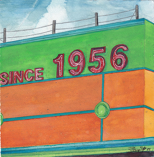 This painting captures the bold, sun-washed façade of Souvenir City in Gulf Shores, Alabama, centering on the glowing red lettering that proudly reads “Since 1956.” Vibrant greens and warm oranges reflect the playful energy of a classic beach-town landmark, while clean lines and soft textures suggest years of salt air and summer crowds. Set beneath an open coastal sky, the building feels both festive and enduring. The piece celebrates seaside nostalgia—a place where memories are bought, summers linger, and tradition has stood bright for generations.